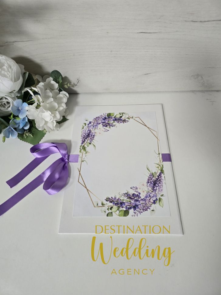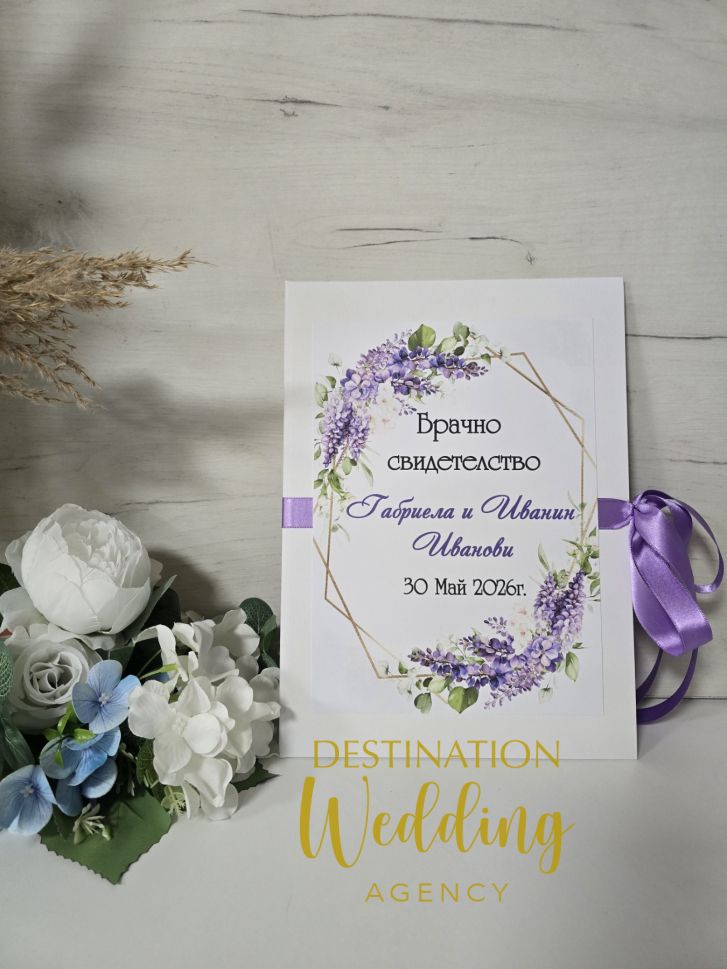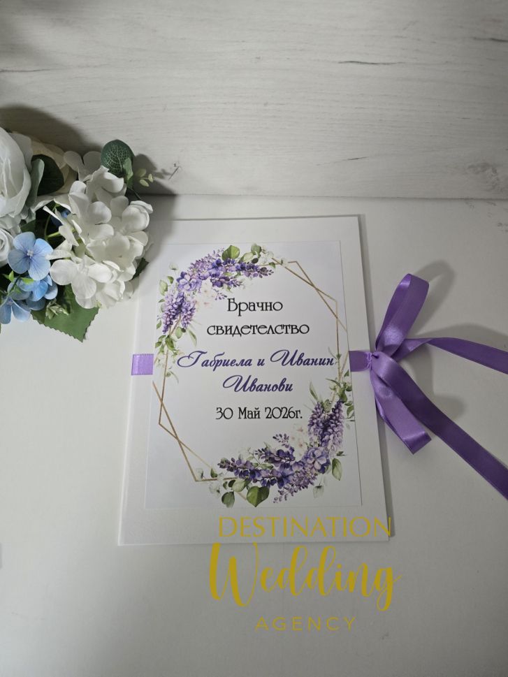 Папка за брачно свидетелство в лилав дизайн, в която да съхраните най-важният документ от сватбения ден. Папката може да бъде персонализирана спрямо вашите желания. В поле коментар добавете желаните надписи - имена/инициали/дата.