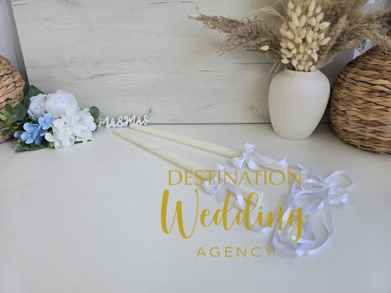 Изберете ритуални свещи за вашия църковния брак, с лента и панделка в цвят по избор. Дължината на свещите може да бъде 40 см или 45 см. Формата е спираловидна или кръгла, със златна или сребърна нишка.