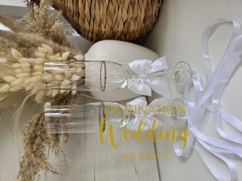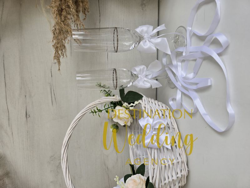 Предлагаме и декорация за бутилка шампанско в тон с декорацията на чашите.