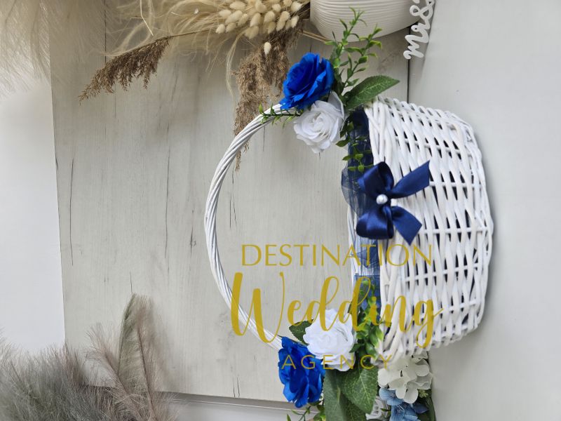 Кошничка, декорирана със сини цветя. Може да бъде използвана за сватбени късметчета, розови листчета, подаръци за гостите или друго приложение.
