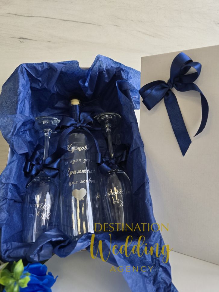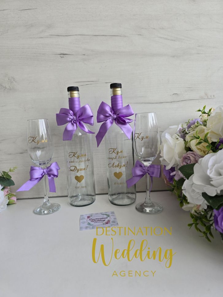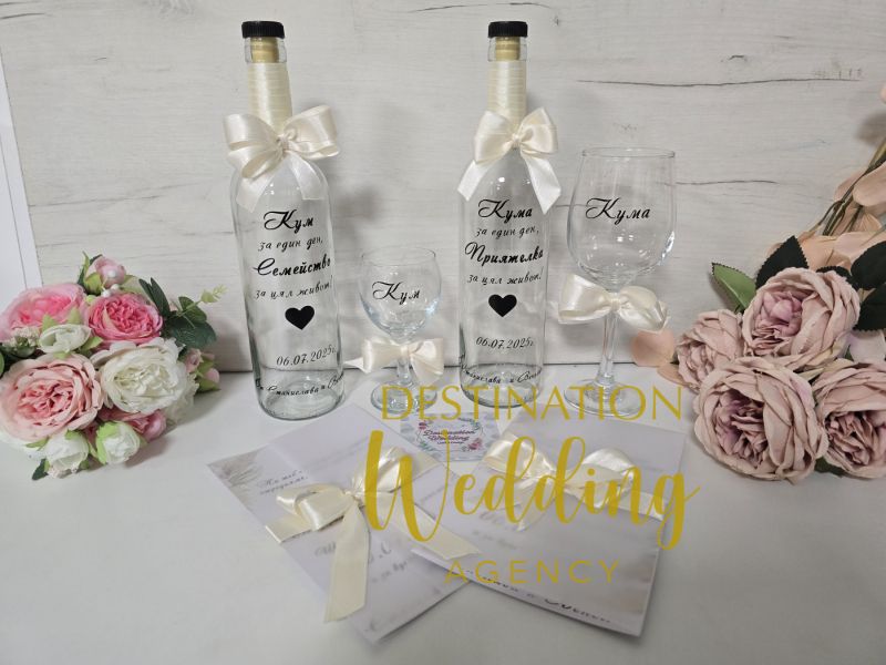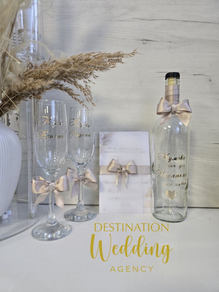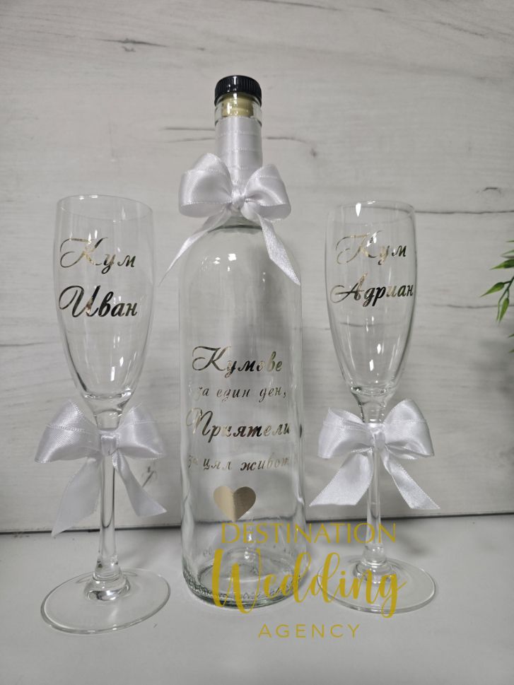Комплект за канене на кумове с чаши за шампанско и бутилка