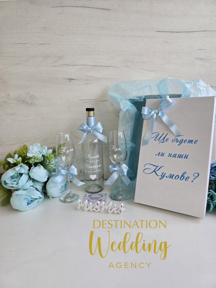 Комплект за канене на кумове с чаши за шампанско и бутилка в избрана от вас цветова гама. Поканете своите кумове с този красив комплект, който ние ще изработим спрямо вашите желания. Стандартният комплект съдържа: