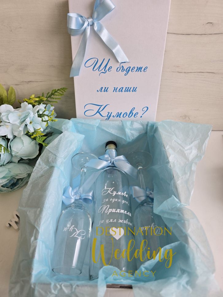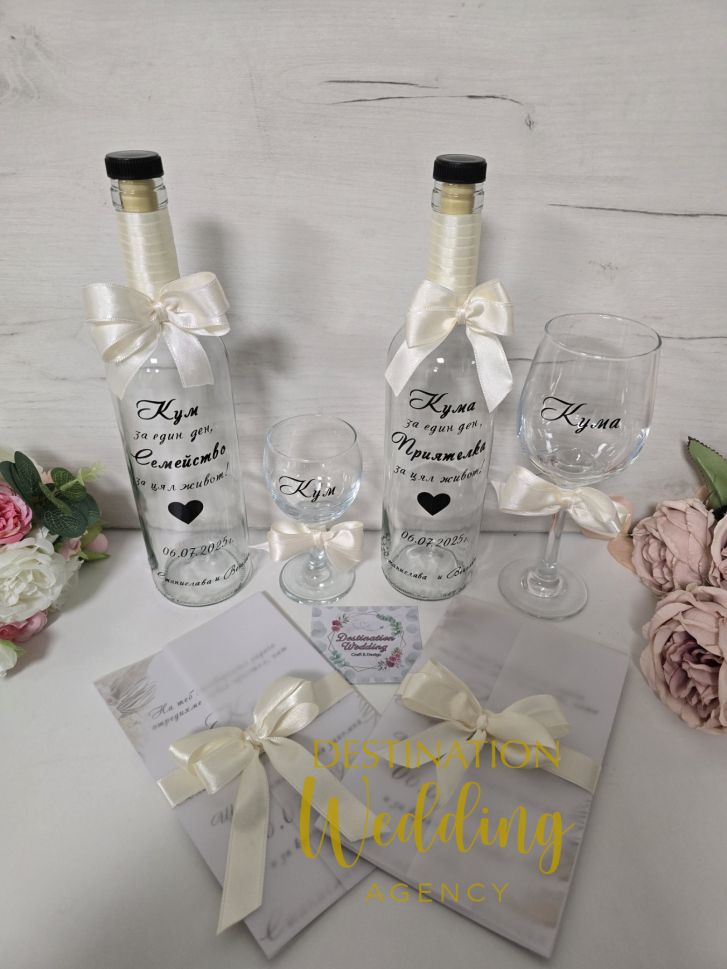 Този вид компкет е предназначен както за покана на семейство/двойка, така и за единична покана на Кум/Кума. Ако желаете можем да изработим комплектът с надпис Кум/Кума и един брой чаша, бутилка и покана. По този начин ще можете да поднесете отделна щайгичка на вашите кумове.