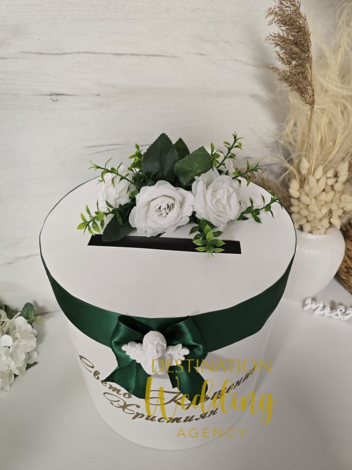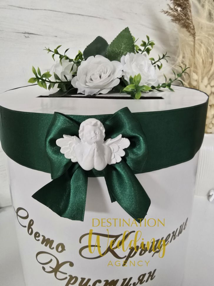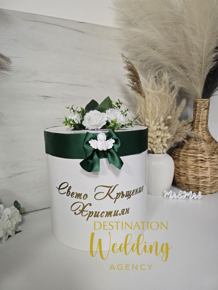 Стилна и изискана кутия за събиране на парични подаръци, специално изработена за тържеството по Свето Кръщение.