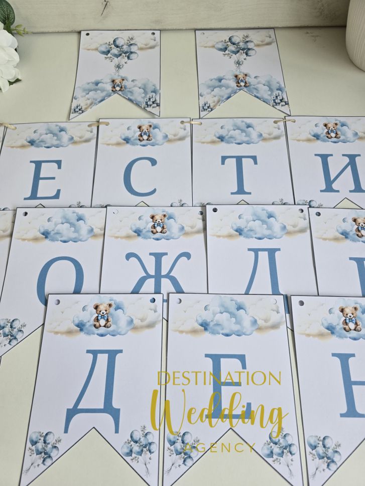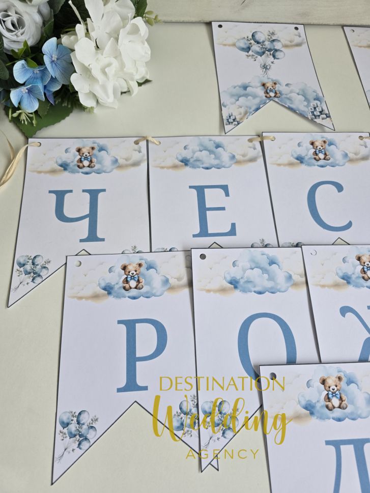 Банер „Честит рожден ден“ с мече и сини облачета