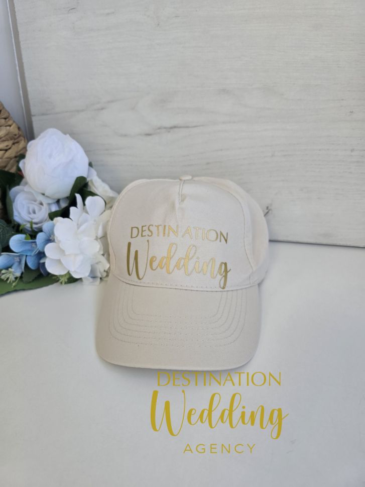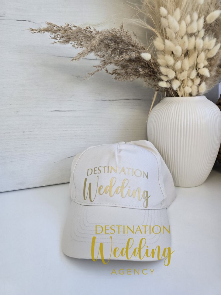 Бяла сватбена шапка със златен надпис „Destination Wedding“ – стилен аксесоар за булка, моминско парти, пътуване и сватбена фотосесия.