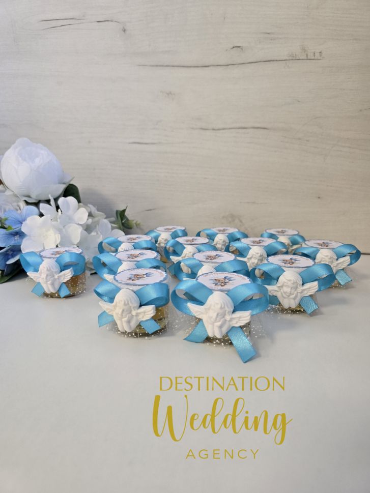 Всяко бурканче е внимателно декорирано с елегантна сатенена панделка, декоративно ангелче и персонализиран етикет с името на детето и датата на кръщенето. Тази нежна комбинация превръща медчето не само в подарък, а и в красива част от украсата на празничната маса.