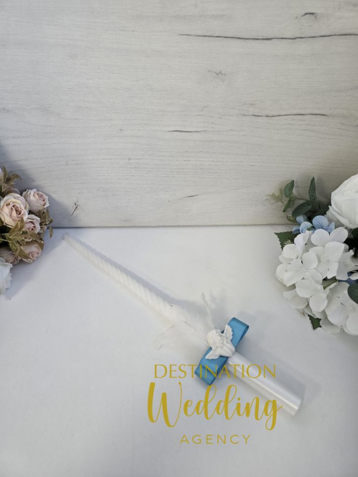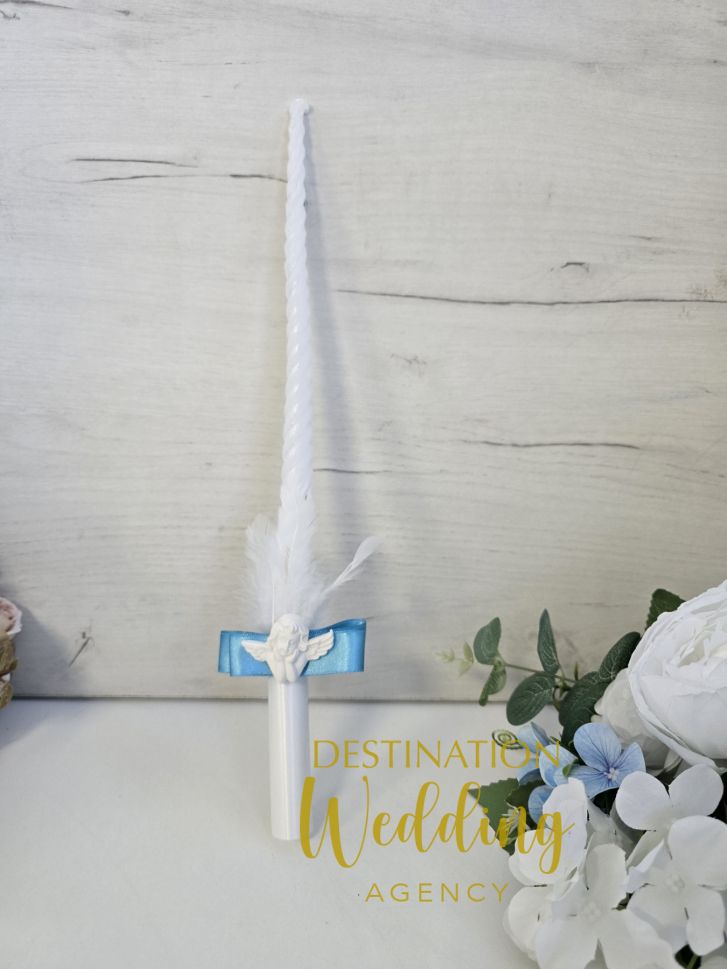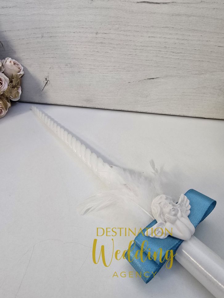 Елегантна църковна свещ за кръщене с декорация ангелче, перо и синя панделка.